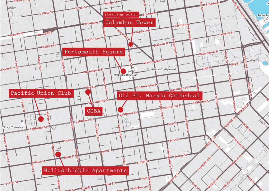 Du börjar framför Columbus Tower. Väl där öppnar du kuvertet och börjar.